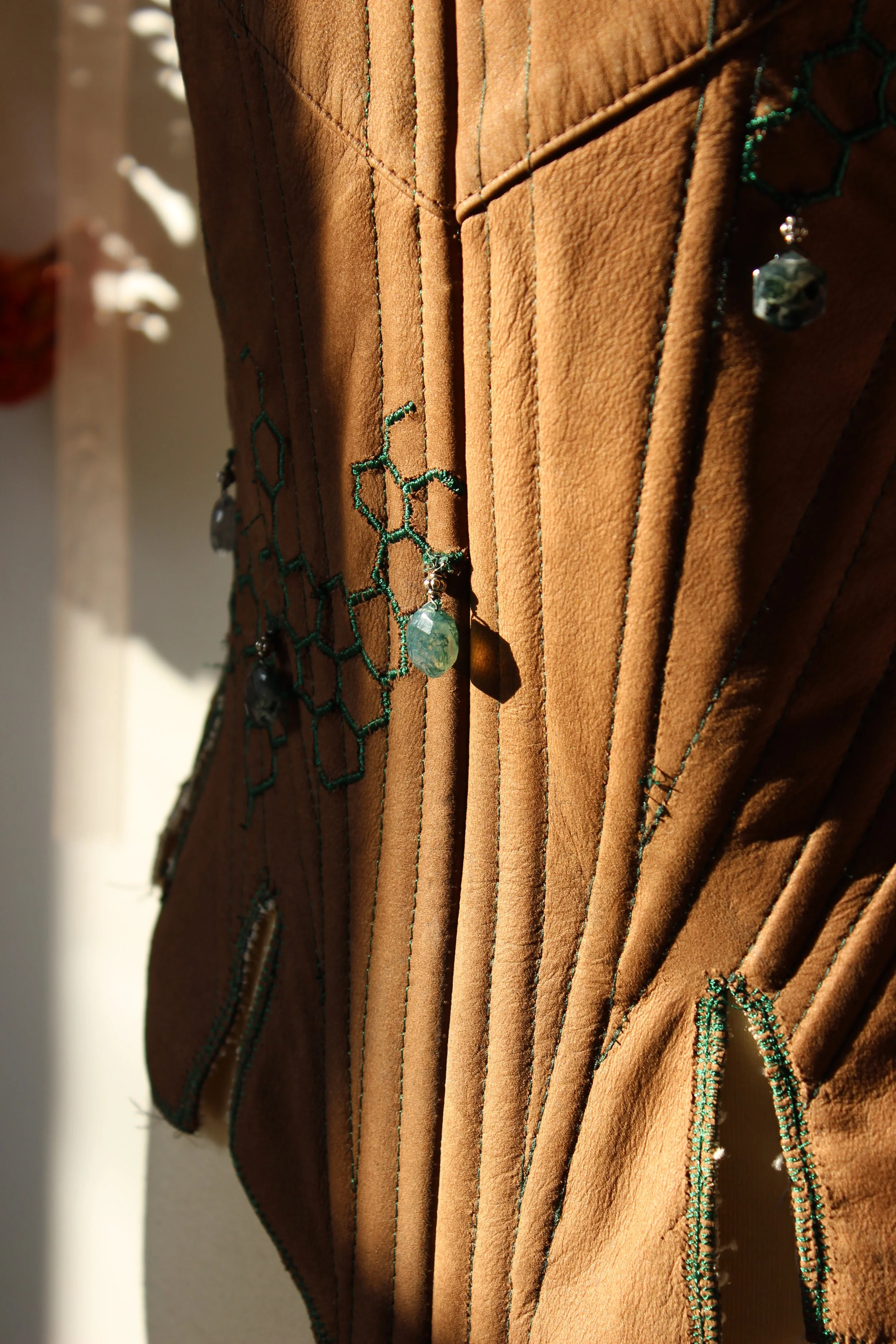 Thrifted Lamb skin leather, sewn with embroidery threads. Genuine moss agate pendants jeweled with gun metal hardware. Waxed cotton cord. Technical exploration: freehand machine embroidery on leather. Raw hem. Very rough around the edge.